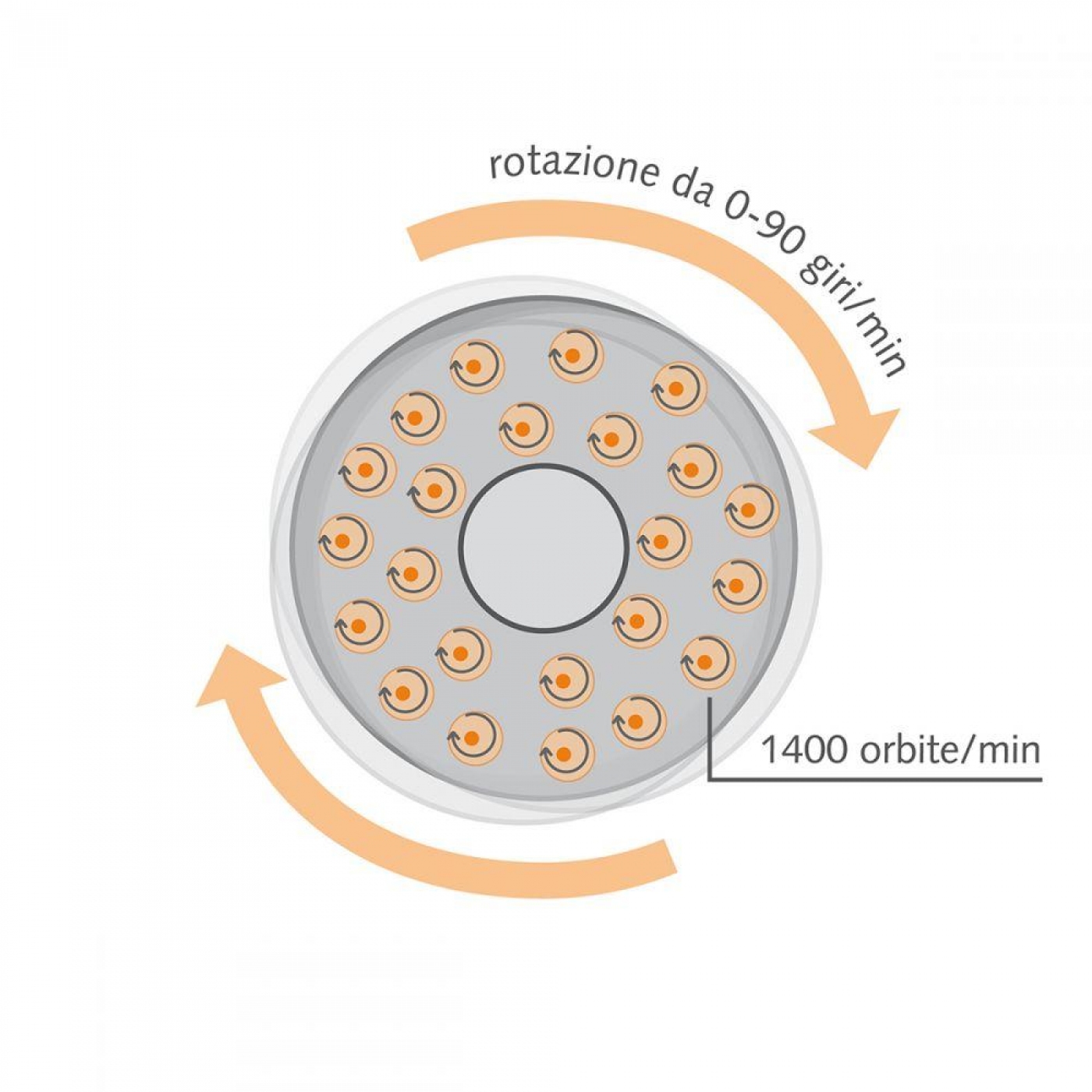 - Două mișcări într-o singură: rotatie-orbitala: simultan in timpul rotației a discului, care poate varia la 0 la 90 rot / min, sistemul generează întotdeauna o miscare orbitala constantă, care permite sa treaca de multe ori în același punct, foarte repede. Pe suprafețe cum ar fi pardoseli dure, pardoseli elastice, lemn, rășini, covoare, aceasta creează mișcări de rotație cu un diametru de aproximativ 1 cm, de 1400 de ori/ minut. Acest lucru garantează o performanță extraordinară si rapidă în spălare, lustruire și cristalizare.